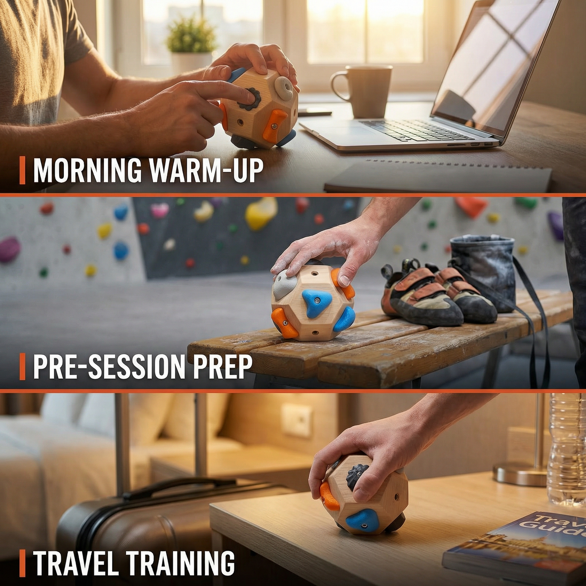 Build daily finger strength between gym sessions. 10 minutes on GripBlock warms up your flexors and sharpens route reading before you even chalk up.
